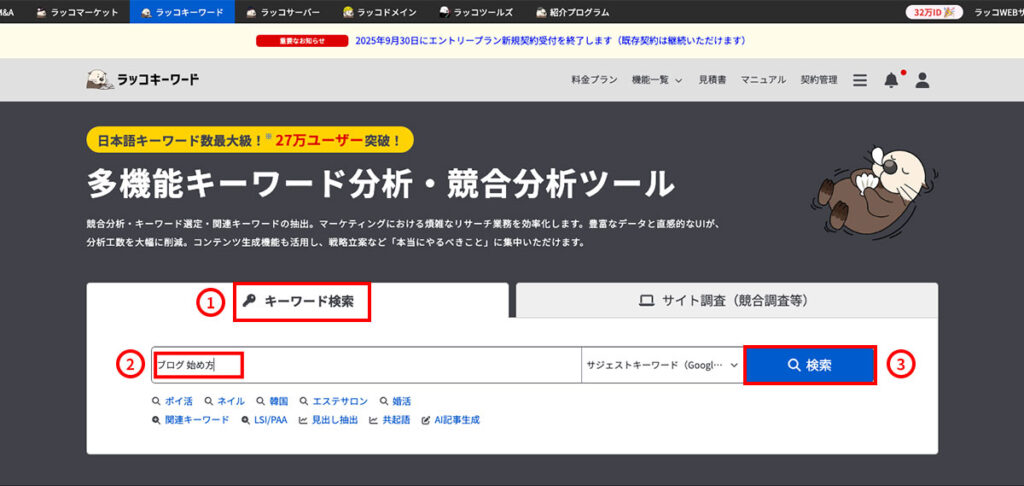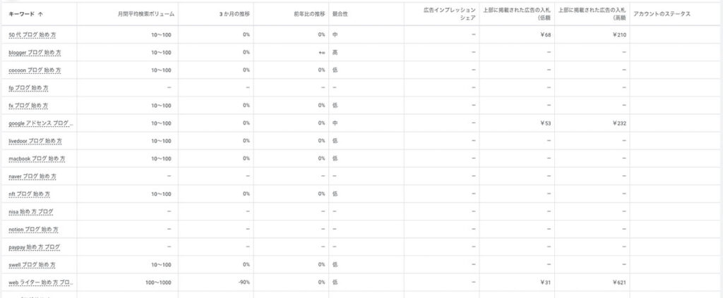 ラッコキーワード(有料プラン)やキーワードプランナーで検索ボリュームを確認することができます。