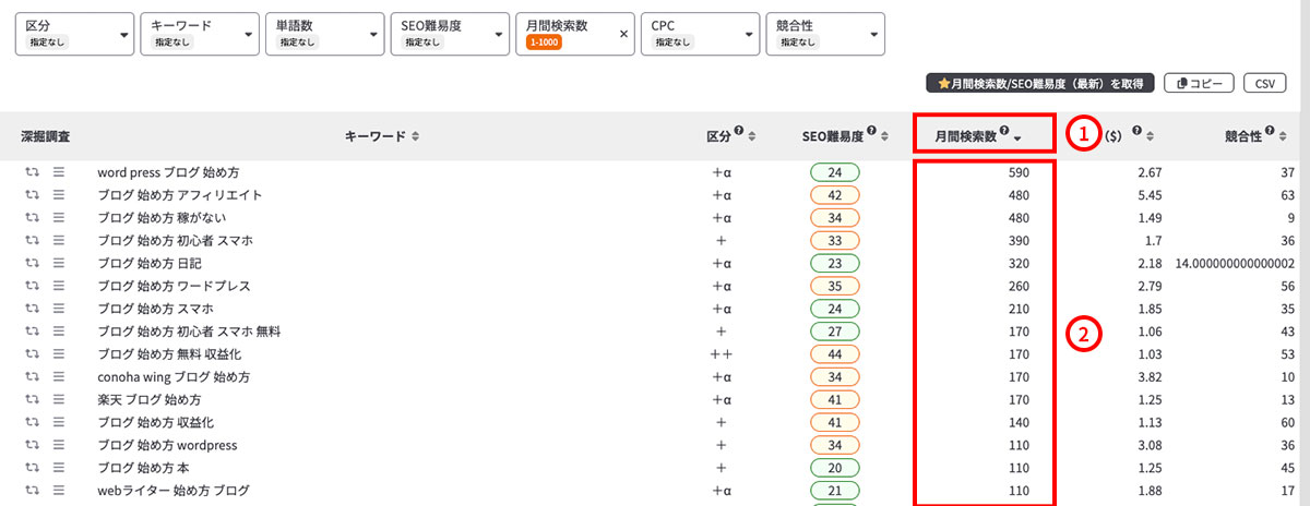 キーワード選定では、この検索ボリュームを目安に、需要のある言葉を見つけることがとても重要です。