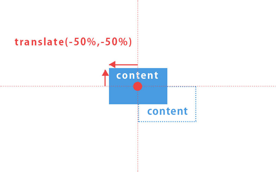 そして、さらに「transform: translate(-50%,-50%)」とすると、「left: 50%」と「top: 50%」は親要素の幅と高さに対して50%移動しますが、「transform」は自分の幅と高さに対しての50%移動します。よって下のイメージのように画面の縦横センターに配置することができます。