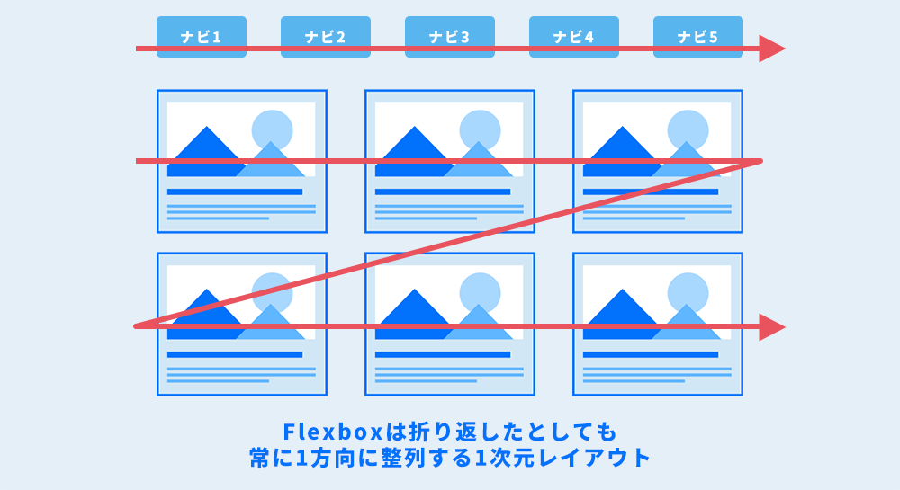 Flexboxは1次元レイアウトを得意とします。たとえば、横並びのナビゲーションメニューや、Zに折り返して整列するカード型ボックスなど、単一方向に整列させます。