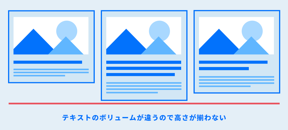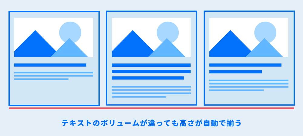 たとえば、画像とテキストを含む複数のカード型ボックスを横並びにしたとき、内容量が違うと高さがバラバラになって見た目が崩れてしまいます。