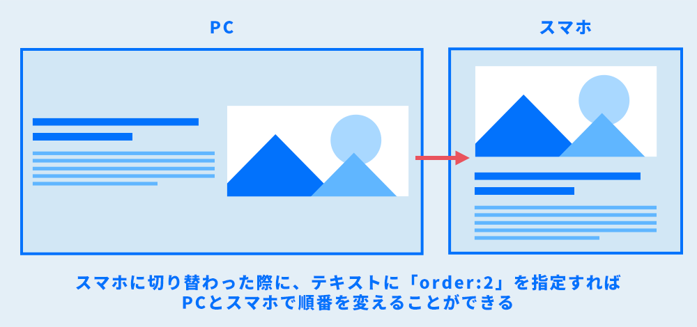 たとえば、PC表示ではテキストを先に、モバイル表示では画像を先に表示したいといった場合でも、HTMLは変えずにCSSだけで制御可能です。