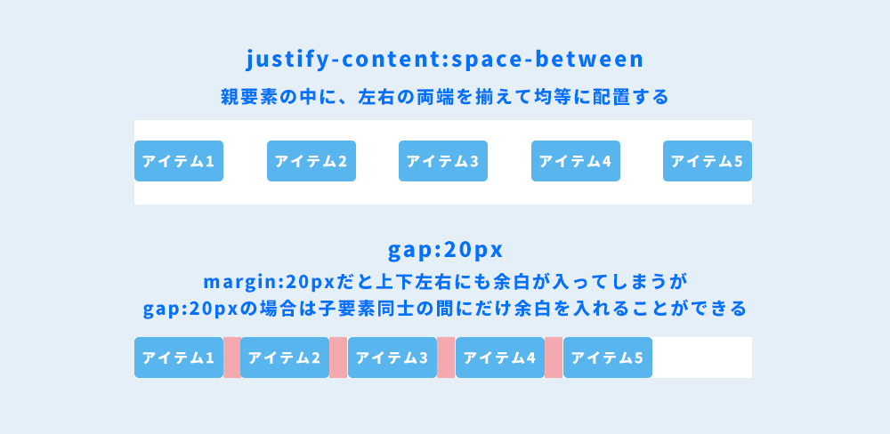 しかしFlexboxでは、justify-contentやgapプロパティを使うことで、全体の配置バランスと余白を一括で調整できます。