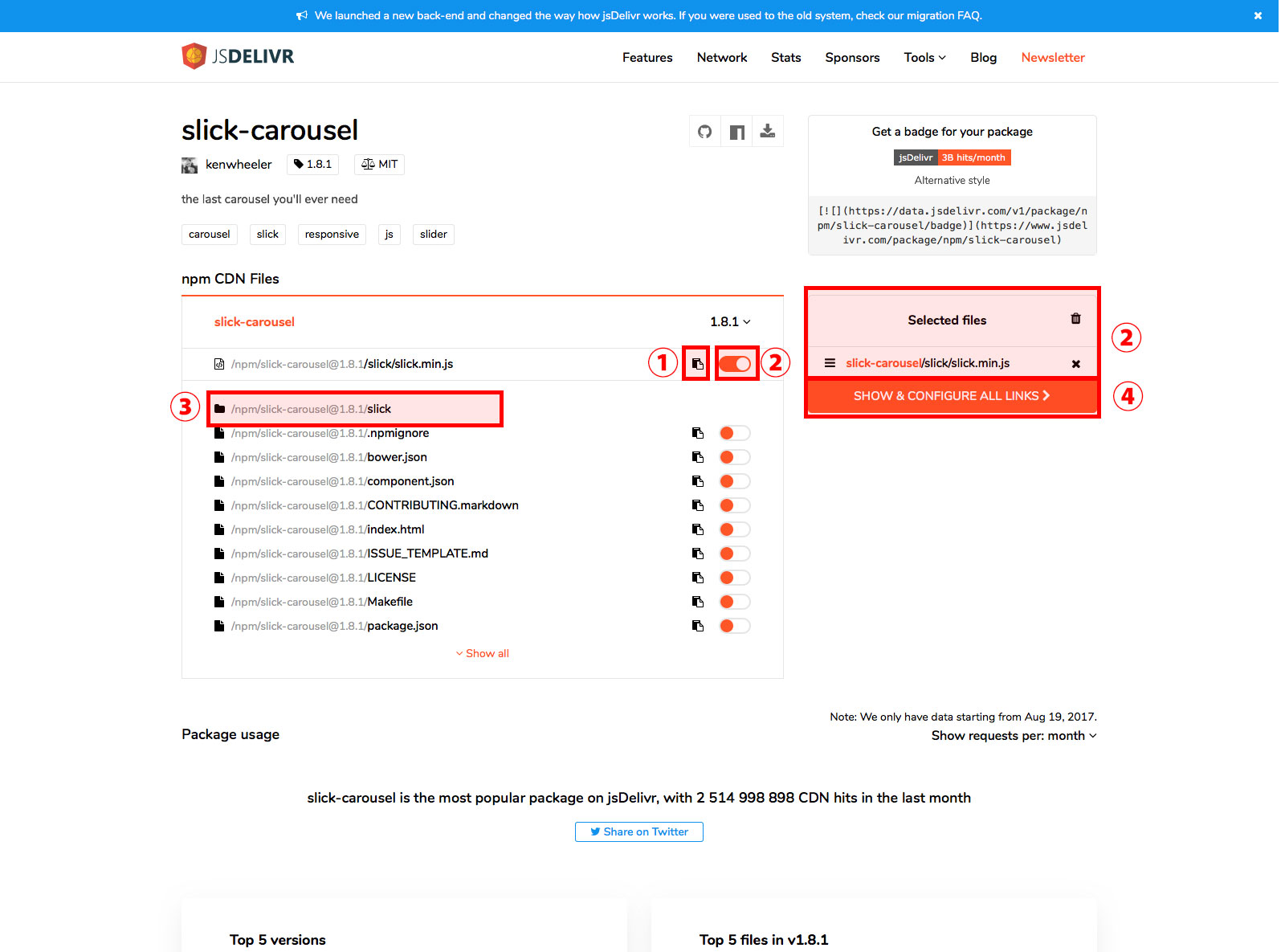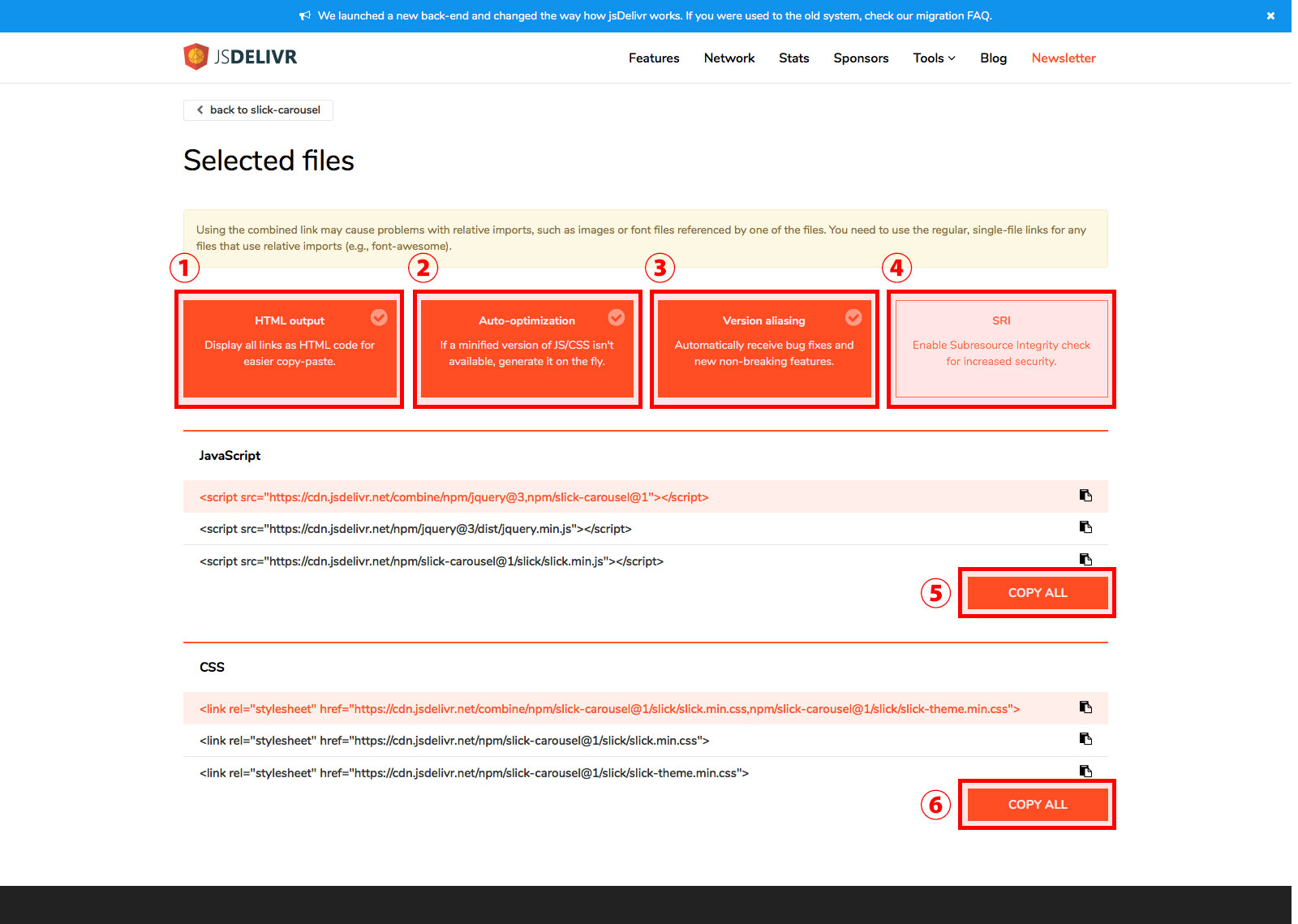 今回はjQuery本体と「slick-carousel」のスタイルシートもコレクションしました。「SHOW & CONFIGURE ALL LINKS 」をクリックします。