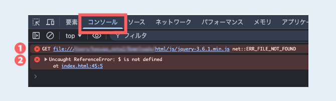 ①「net::ERR_FILE_NOTFOUND」や②「Uncaught ReferenceError: $ is not defined」といったエラーが出ていないか確認。