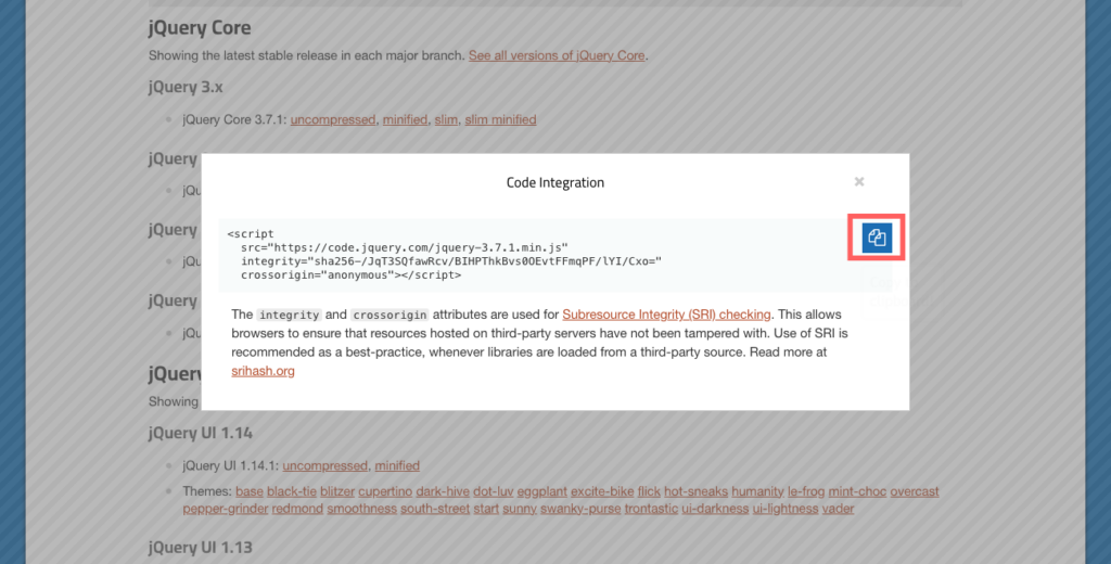 最もシンプルで信頼性が高いのが、jQueryの開発元であるjQuery公式のCDNです。以下のように、公式サイトから直接スクリプトタグを取得できます。