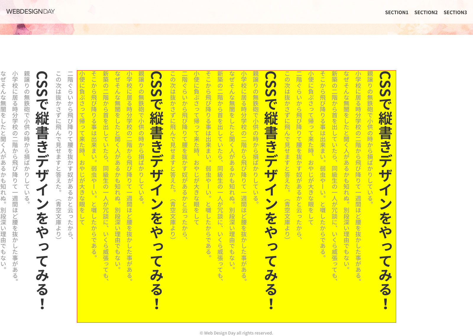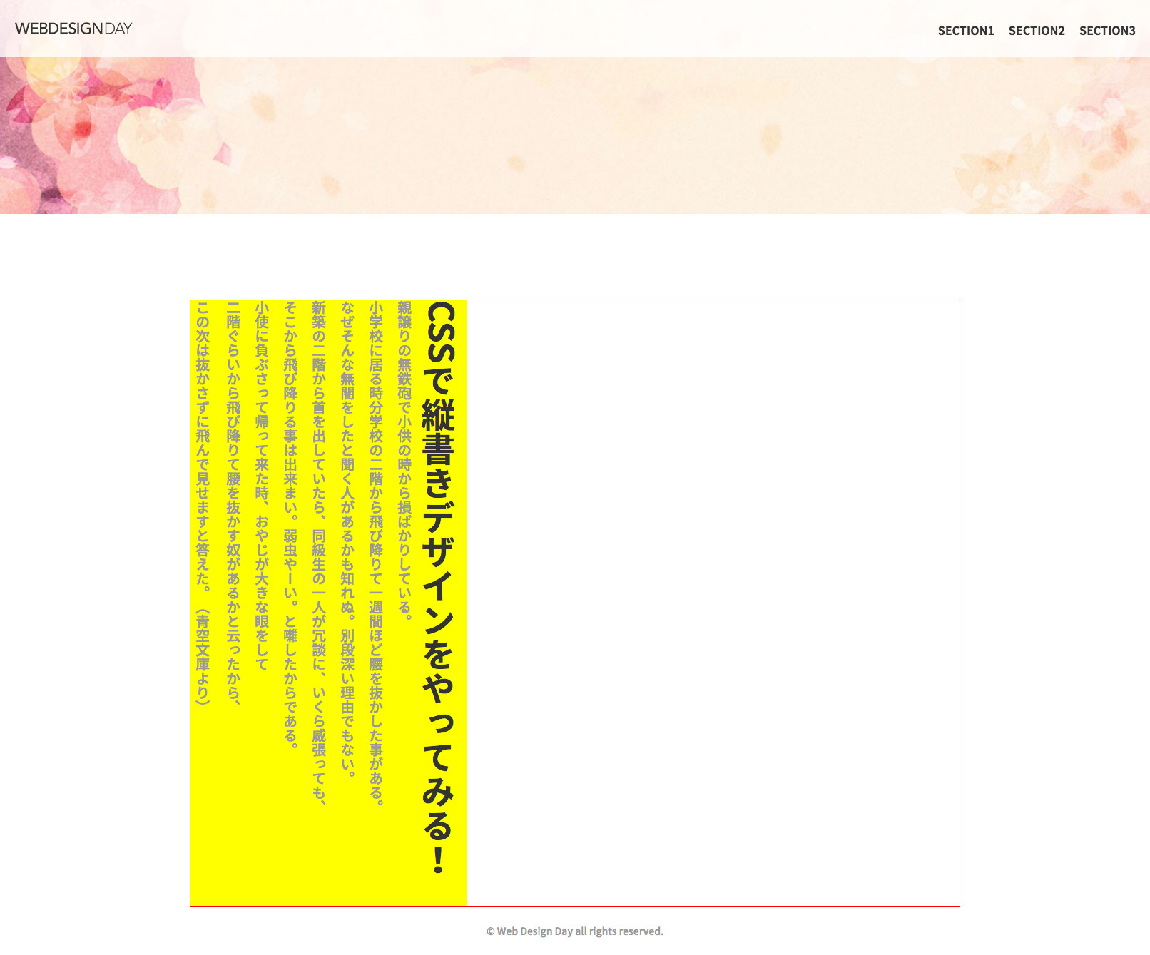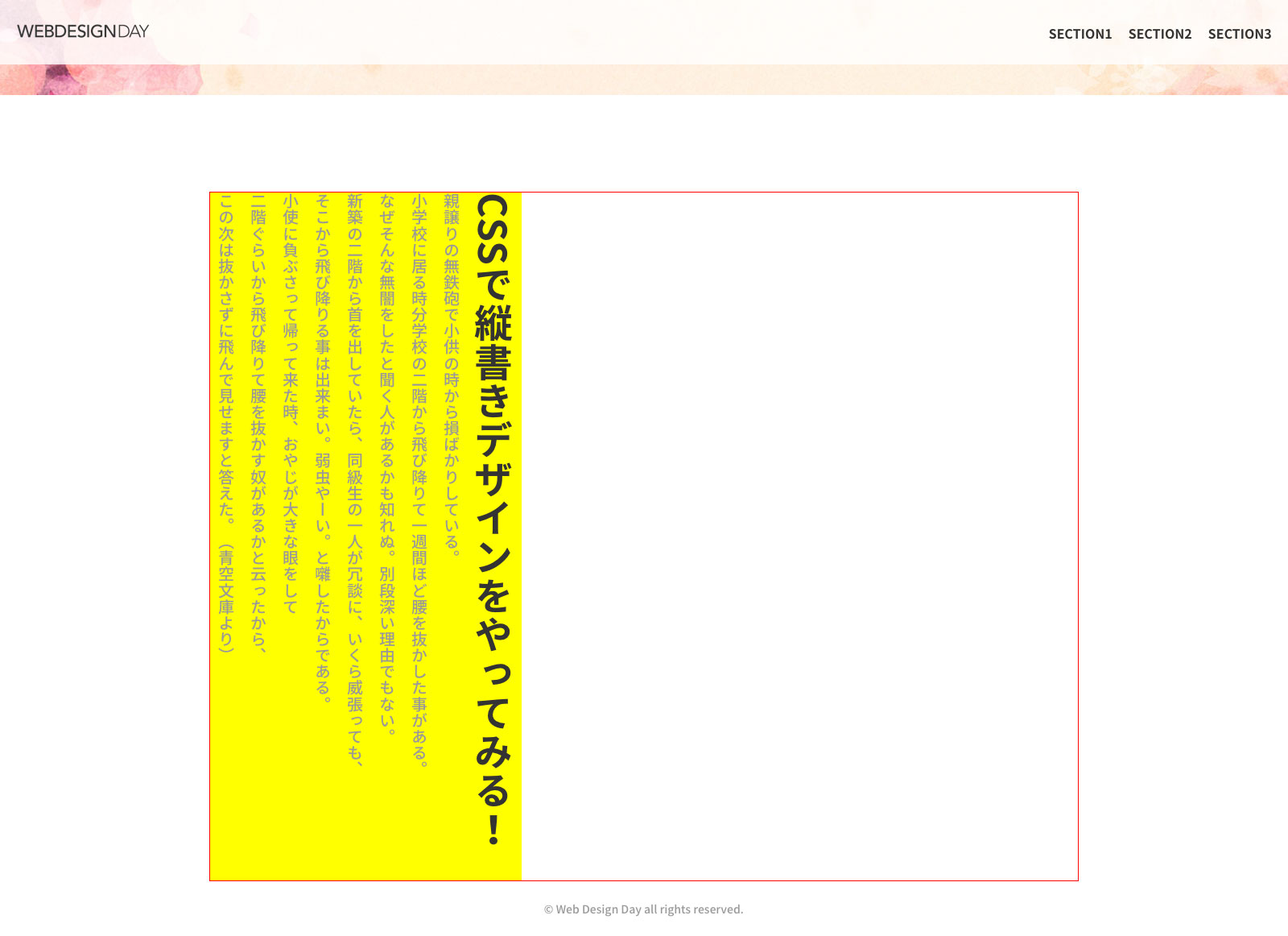 段落ごとに「.box」でラップして、それぞれに「.mixed」、「.upright」、「.sideways」クラスを付けました。