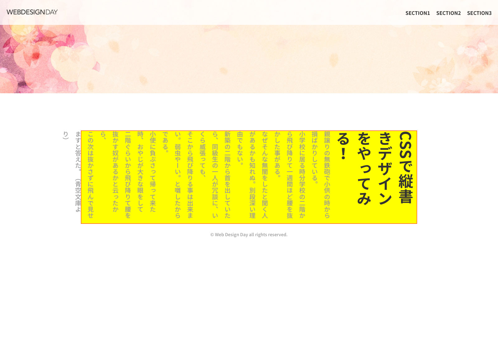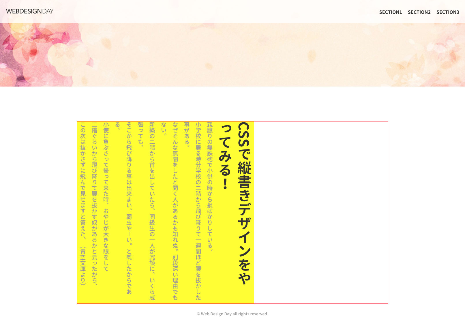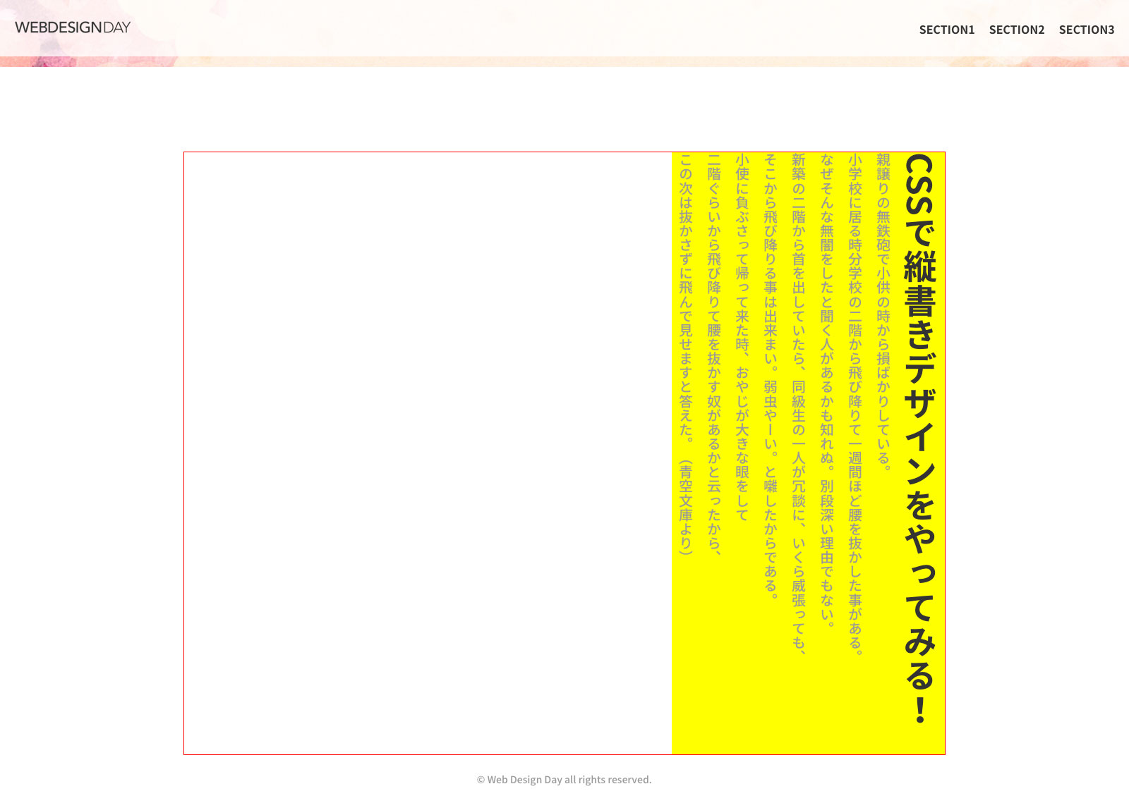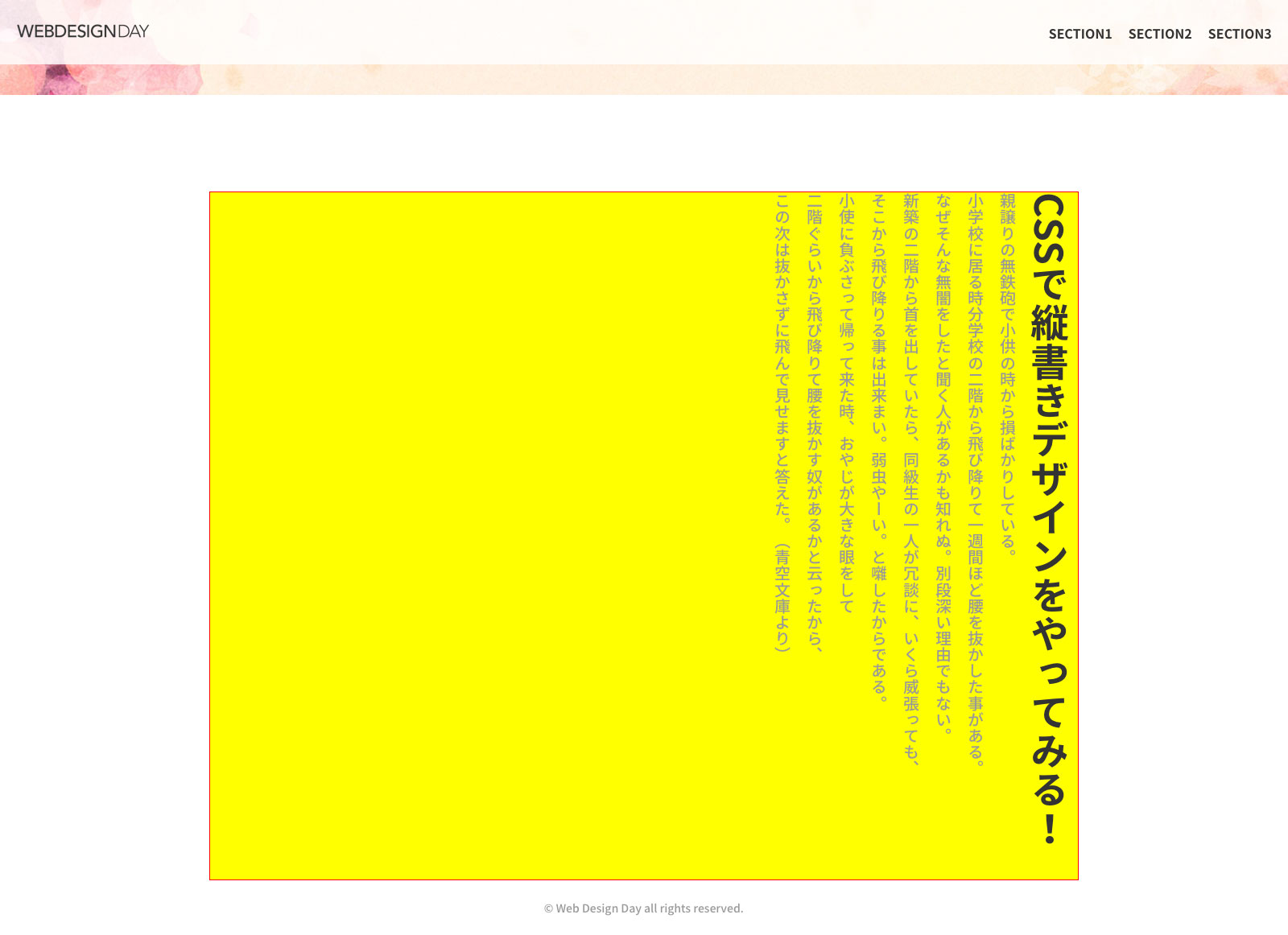 段落ごとに「.box」でラップして、それぞれに「.mixed」、「.upright」、「.sideways」クラスを付けました。
