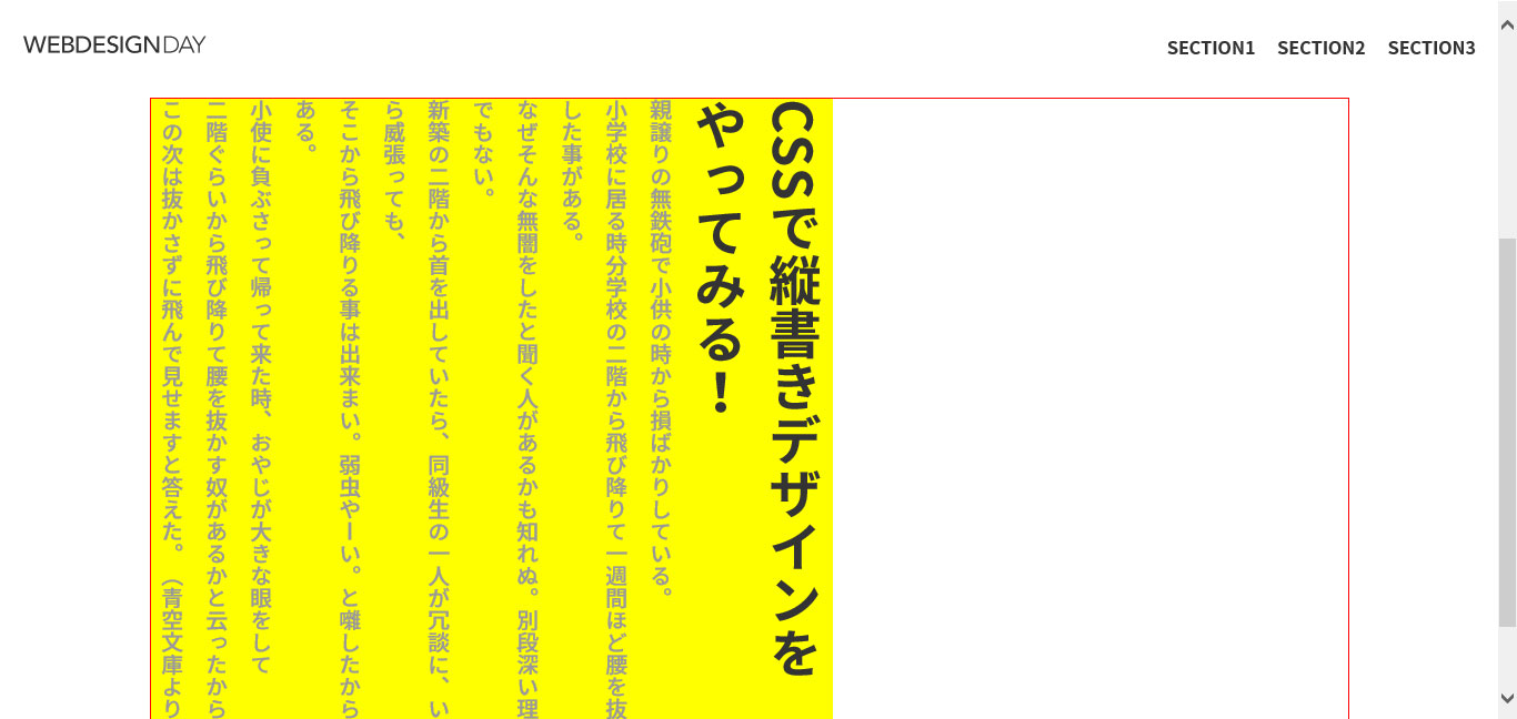 表示のされ方を検証するので、わかりやすいように「.tategaki-wrap」に赤枠つけました。同じくわかりやすいように「.tategaki」に背景色つけました。
