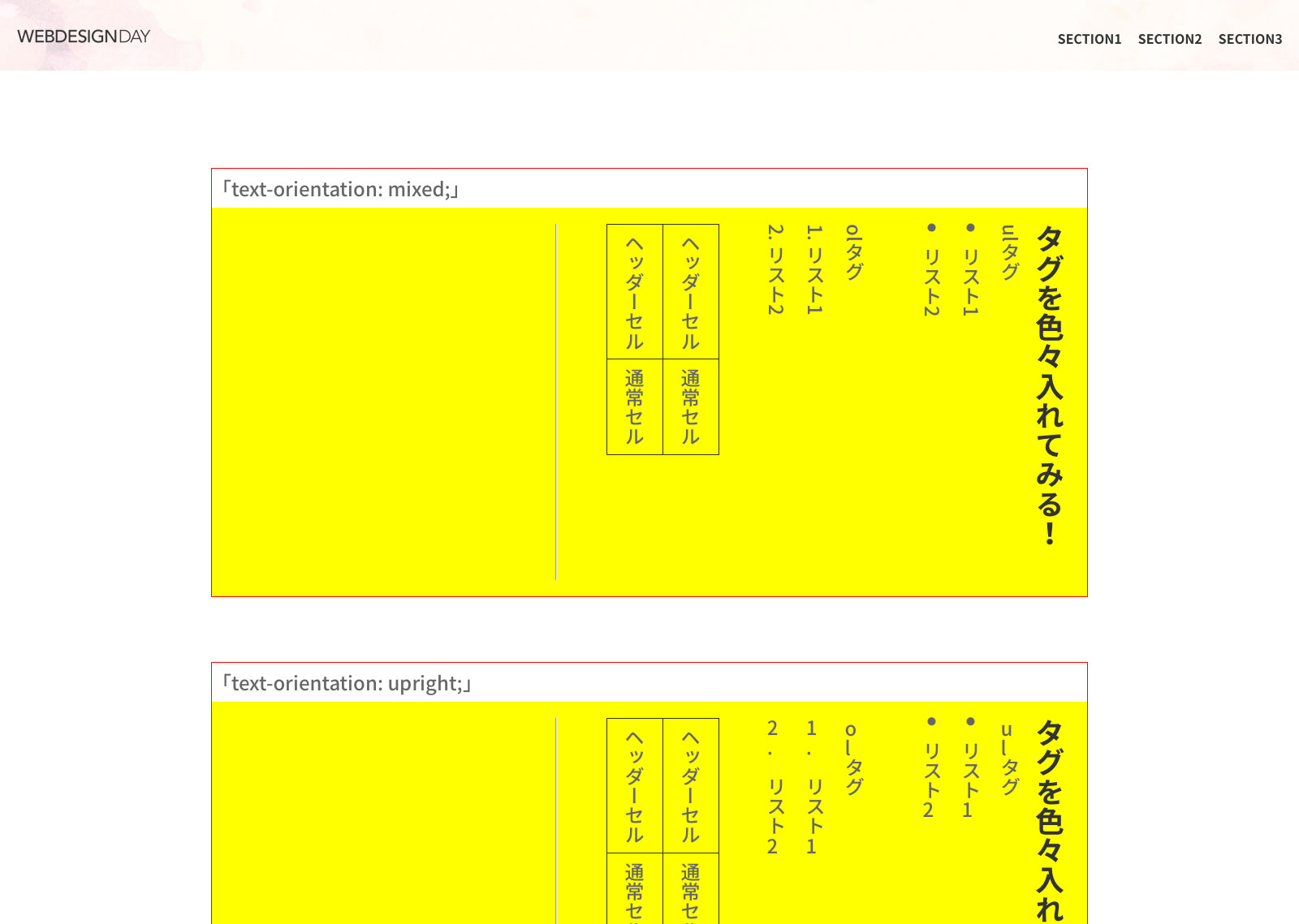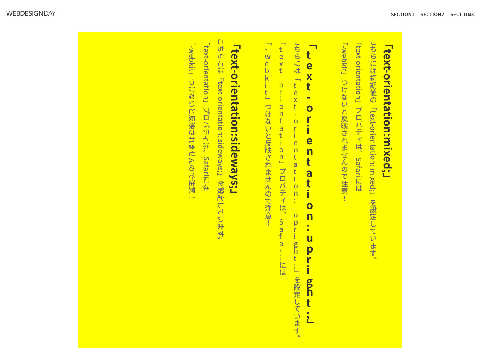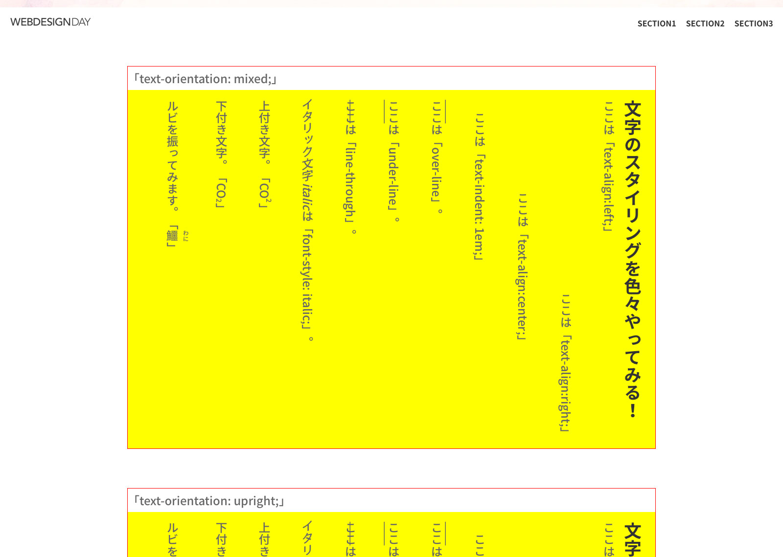さらに「text-orientation」も「mixed」、「upright」、「sideways」の3パターンでやっていますのでサンプルを見てみてください。