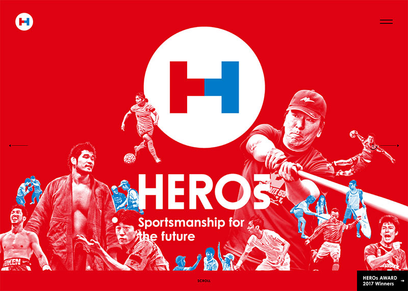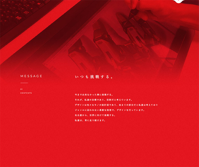 ファーストビューを赤ベースのデュオトーンで見せています。サイトで使用している画像が全体的にキーカラーの赤か青どちらかのデュオトーンになっています。力強い大きめのフォントもインパクトがあります。