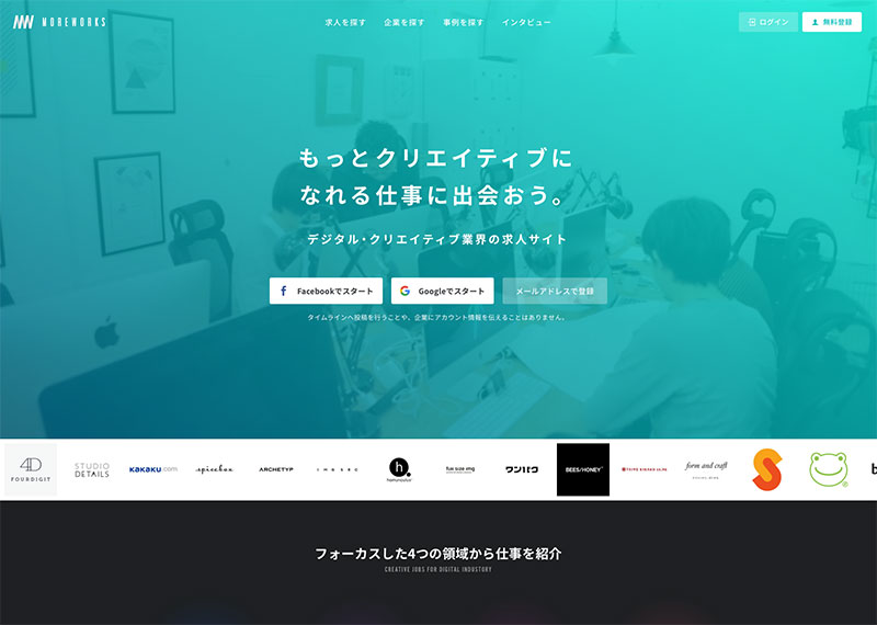 デジタル・クリエイティブ関連の求人を扱うMOREWORKS。クリエイターの端くれとしてイチ利用者だった頃が懐かしい。グラデーションがスタイリッシュなサイトです。